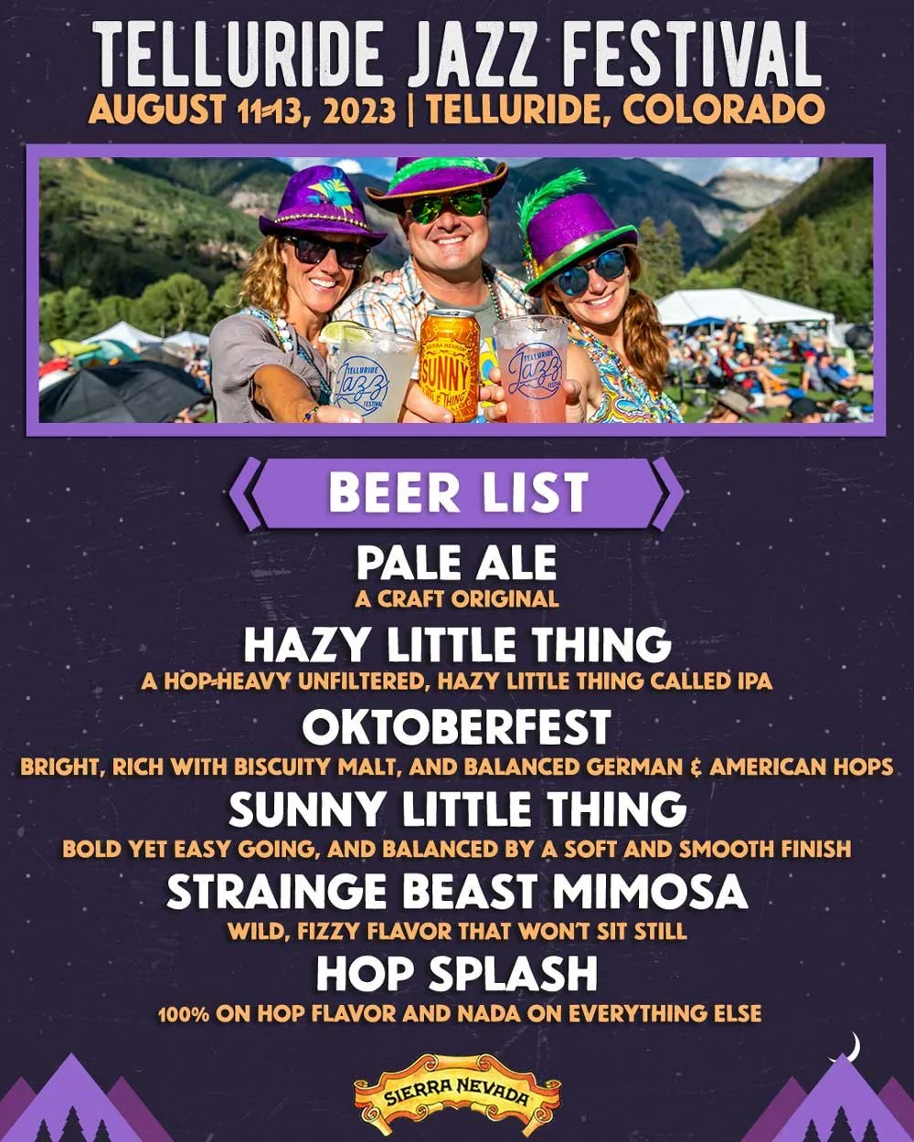 The Telluride Jazz Festival is thrilled to team up with Sierra Nevada Brewing Company again for the 2023 Festival! Founded back in 1980, Sierra Nevada Brewing Co. is one of America’s premier craft breweries today and is highly regarded for using only the finest quality ingredients. The pioneering spirit that launched Sierra Nevada now spans both US coasts with breweries in Chico, California and Mills River, North Carolina. Sierra Nevada has set the standard for craft brewers worldwide with impressive innovations in the brew-house as well as leading sustainability initiatives. Sierra Nevada is also an industry leader for artisan brewers worldwide taking home numerous awards for their wide variety of beers and ales, including the legendary Pale Ale.