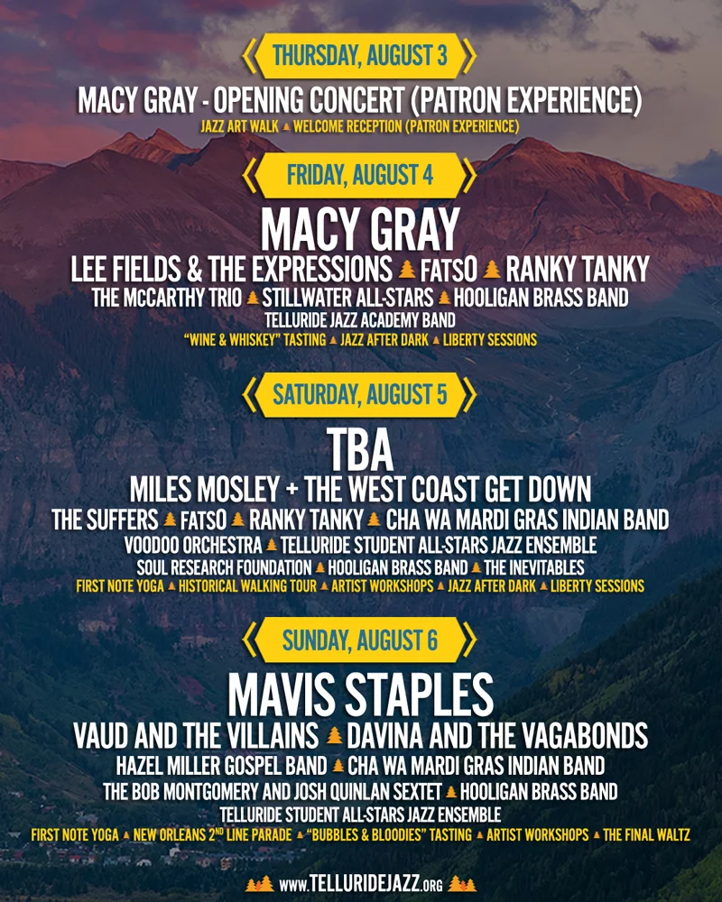 To kick off the festival, Thursday features a new “Jazz Art Walk” in historic Downtown Telluride. Free and open to the public from 5:00 to 8:00 pm, the "Jazz Art Walk" will feature four different galleries with fine art and live jazz. Thursday evening will also host exclusive events for Patron Experience pass-holders, including a welcoming reception at Rustico Ristorante followed by a private, opening concert with headliner Macy Gray at the Sheridan Opera House.
